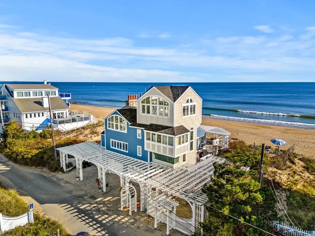 Wake up to the sound of waves and sunlight dancing across the water. This is beachfront living, redefined. Nestled beside the iconic Blue Inn Hotel, this 2,559 sq. ft. Plum Island retreat offers uninterrupted ocean views from every deck, including from the home’s highest point, where the Atlantic feels close enough to touch. Designed for elevated coastal living and smart investment, its flexible layout supports 2–3 cash-flowing vacation units. Inside, open spaces flow onto wraparound decks, while amenities like a steam shower, dual fireplaces, and a second-floor kitchenette deliver comfort with character. Dunes on either side create rare natural privacy, while five parking spots (including a garage with a Tesla charger) offer convenience few coastal homes can match. Explore the vibrant charm of Plum Island or take a quick six-minute drive to Newburyport. Seeking passive income, a personal escape, or both? Up to you. It's luxury you can live in or live off.