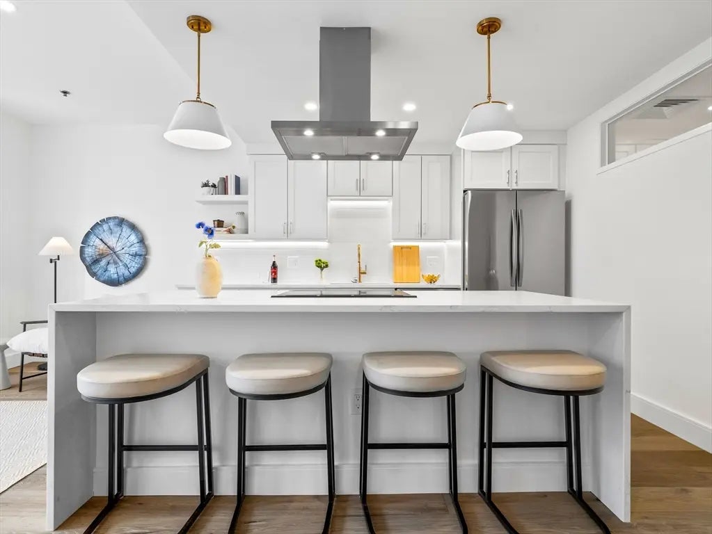 Welcome to Unit 702 at Strada 234 — a beautifully renovated one-bedroom that combines smart design with modern finishes. While this home doesn't offer city views, it more than makes up for it with its thoughtfully designed layout and incredible storage throughout. Step into a bright, open-concept living space featuring new flooring, recessed lighting, and a sleek kitchen with a waterfall island, quartz countertops, stainless steel appliances, and a stylish tile backsplash. The spacious bathroom includes designer tile, accent lighting, and a tiled walk-in shower. A full-size washer and dryer are neatly tucked behind a pocket door for added convenience, and the ample storage solutions make this home as functional as it is beautiful. Strada234 features a 24/7 concierge, on site management and a fitness room.