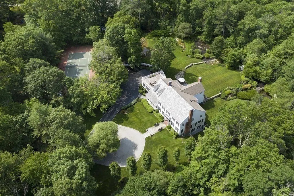 This stately residence not only affords privacy but also an estate like feel offering 5+ acres of lush landscaping. A classic Colonial home w/ a traditional feeling offers many rooms to accommodate a large family or simply many house guests! A lovely kitchen with a fireplaced breakfast nook is adjacent to a coffered ceiling dining room makes entertaining a breeze. You will enjoy a formal living room, a spacious family room with a cozy fireplace, an in home office/den, a mud room that also doubles as a first floor laundry room & a first floor en-suite bedroom. The 2nd floor hosts a master suite w/ a fire place, large master bath & another laundry area. There are 3 other en-suite bedrooms, one with a loft & one w/ a large deck off it it to enjoy coffee or cocktails while overlooking the professionally landscaped yard. The lower level is now used for a playroom and a home gym. The tennis court with basketball hoops will provide endless entertainment.