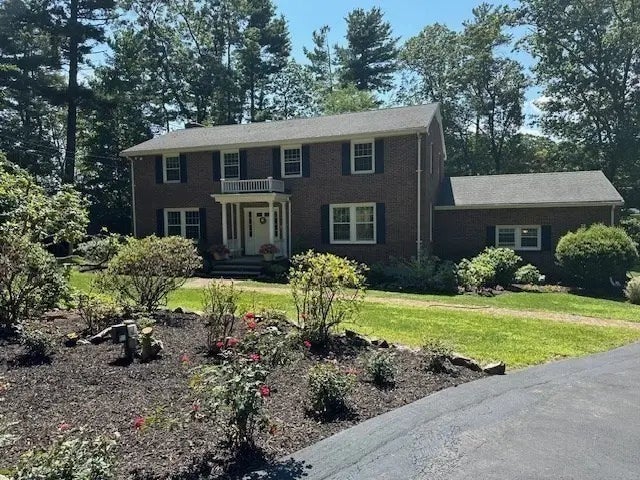 Classic brick Colonial on a 1.14 acre estate adjacent to Blue Hill Country Club offering 5 bedrooms, 2.5 baths, and nearly 2,900 sq ft of living space. Features include formal living and dining rooms, a warm kitchen with fireplace and casual seating, and a step down great room with beamed cathedral ceiling and second fireplace. The spacious primary suite is joined by three additional bedrooms and another full bath. Expansive grounds provide privacy, mature landscaping, and possible subdivision with approvals. Easy to show and in move in condition with a functional layout perfect for both formal and casual living. Enjoy immediate comfort with potential to personalize. Conveniently located near schools, shopping, public transportation, and major highways.