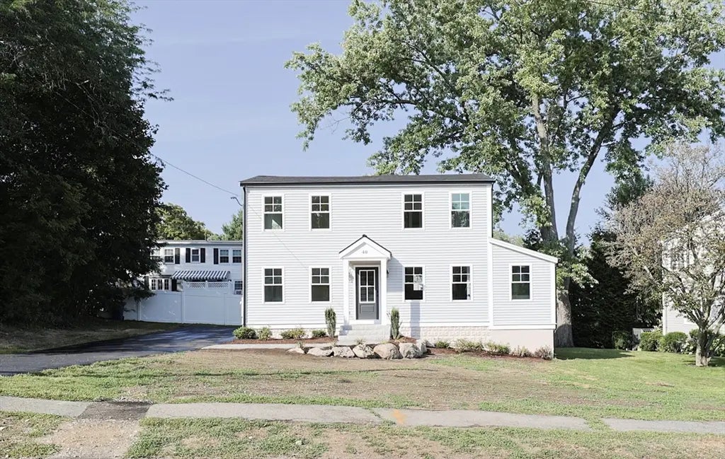 This stunning, gut renovated home offers 4 bedrooms, 3 full bathrooms, and approximately 1,700 sq ft of beautifully designed living space. The open-concept first floor is perfect for entertaining, featuring a stylish kitchen with island seating, an arched coffee/dry bar, and adjacent dining area. A mudroom with coat closet, walk-in pantry, and a versatile office or sitting room with French doors add function and charm. A spacious first-floor bedroom and nearby full bath make an ideal guest suite or family room. Upstairs, the primary suite boasts 9' ceilings, dual closets, a built-in bookcase, and en-suite bath. Two additional bedrooms and a third full bath complete the upper level. Enjoy a private backyard patio and ample off-street parking—this home is truly a must-see! All new electric, plumbing, HVAC, windows, roof, vinyl siding, hardwood floors, kitchen, bathrooms, etc!