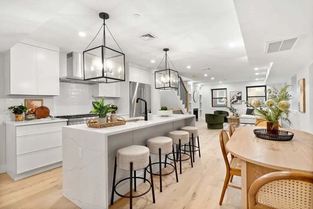 New Construction 3 bed 3 bath penthouse with 3 private decks in stunning brownstone in heart of boston's historic north end. A shell renovation of one of the most architecturally striking homes in the North end brings a seamless blend of modern luxury/amenities with timeless historic charm to this stunning luxury home. With windows abound, the space boasts amazing light offering a dramatic wide open feel to the sprawling living kitchen dining area. A sharp designer finish package caters to the most discerning buyer. Beautiful kitchen w thermador appliances & 11 ft island. Upstairs, both bedrooms feature luxurious en suite baths, with the primary bedroom boasting dbl vanity & glass walk in shower. The balcony off of the primary bedroom offers a great space for fresh air or morning coffee. Upstairs off of the penthouse the back deck offers solid outdoor space & beautiful views of city skyline, North end, & Old north church. 1 Rental parking transferable at sale. 1st year paid by seller