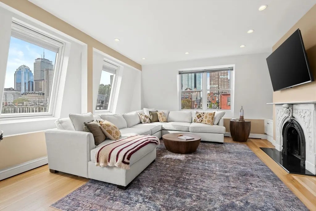 This PH duplex offers 3 exposures providing tremendous light, openness, & soaring city views. The open concept living & dining areas feature 6 updated windows, built-in shelving, & a fireplace with a restored marble mantle. The new kitchen features floor-to-ceiling windows, custom cabinetry, quartz counters, a Thermador gas range, microwave, & dishwasher, a Sub-Zero refrigerator, & a breakfast bar. The primary bedroom has a corner exposure & an exposed brick wall. The second bedroom has built-in shelving, a large closet, & a W/D. Completing this floor is a full bath with a custom vanity, a soaking tub, and a tiled shower. A special feature of this penthouse unit is the head house/ office leading to the oversized private roof deck. Other features include: refinished HW floors, new forced air heating/cooling, recessed lighting, & interior paint. This professionally managed condo is just steps from shops, restaurants, rental garage parking, public transportation, & all Boston offers.