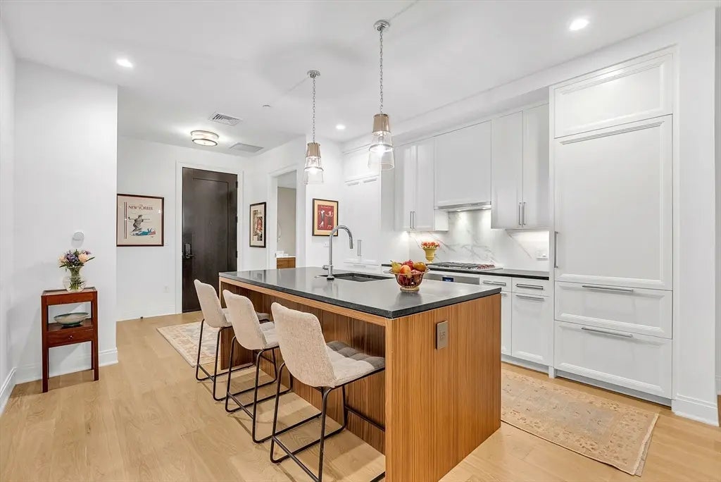 Exceptionally located just a 5-min stroll from both Linden & Wellesley Squares, & steps from the Wellesley Square Commuter Rail station, this home with a courtyard view also includes garage parking for 2 cars, soaring 9’ ceilings & floor-to-ceiling windows, powder room, white oak floors that deliver a warm and timeless sophistication. The gourmet kitchen features Sub-Zero refrigeration & Wolf appliances, generous island, white custom cabinetry, & honed VT Black granite countertops. The primary suite includes walk-in shower, radiant-heated bathroom tiled floors, two expansive California Closets. Step outside to your own private patio to enjoy fresh air and quiet retreat. Premium amenities: concierge service, a beautifully appointed landscaped courtyard w/gas fireplace & grilling stations, fitness ctr w/flex studio, a golf/sports simulator, club room w/catering kitchen, private conference room, pet spa, bike storage, and EV charging. Home available furnished for $1,575,000.