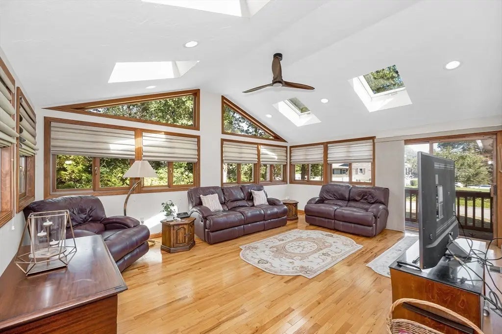 Tucked away in a tranquil neighborhood, this inviting oversized Raised Ranch offers the perfect balance of privacy & convenience! Enjoy the serenity of this almost 1/2 acre lot while being just minutes from shopping, major highways & MBTA train stations. Step inside to find a welcoming open concept fireplaced living room with soaring cathedral ceilings. The well designed kitchen with modern appliances offers an eat-in option while opening to the dining space for effortless entertaining. Relax in the spectacular heated sun room room featuring walls of windows creating a connection to nature year-round. Gleaming hardwood floors grace the living, dining & sun rooms. Down the hall you will find an updated full bath & 3 generous sized bedrooms. The lower level offers a front to back family room & 3/4 bath. The 2 car garage has brand new doors. Amenities include central air & lawn irrigation. Tours of this lovely home begin immediately! A quick closing is possible!