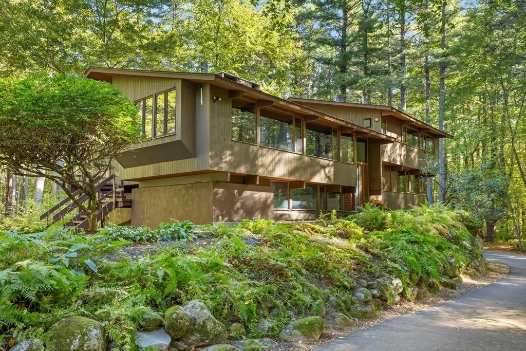 First time on the market! Tucked at the end of a quiet cul-de-sac on the Concord line, this custom-built post & beam Deck House offers a mid-century aesthetic w/soaring cedar ceilings, dramatic Douglas fir beams, rich mahogany millwork & cabinetry & walls of glass. Perched upon a private 2-acre lot among mature trees & views of nature from every window. Designed to bring the outside in, this spacious home offers an ideal layout for both gathering & quiet retreat, w/original features, as well as thoughtful upgrades. Cozy up by 1 of 2 double-sided fireplaces, host gatherings w/ease w/a versatile, open floor plan or on the large deck. 2-car-attached garage for ease of entry. Inside or out, this home invites you to enjoy the beauty surrounding you. Conservation land, trails & waterways are nearby for year-round outdoor escape. Timeless design & unbeatable location close to Carlisle, Concord & Bedford centers. This home offers a rare blend of serenity, privacy & convenience.