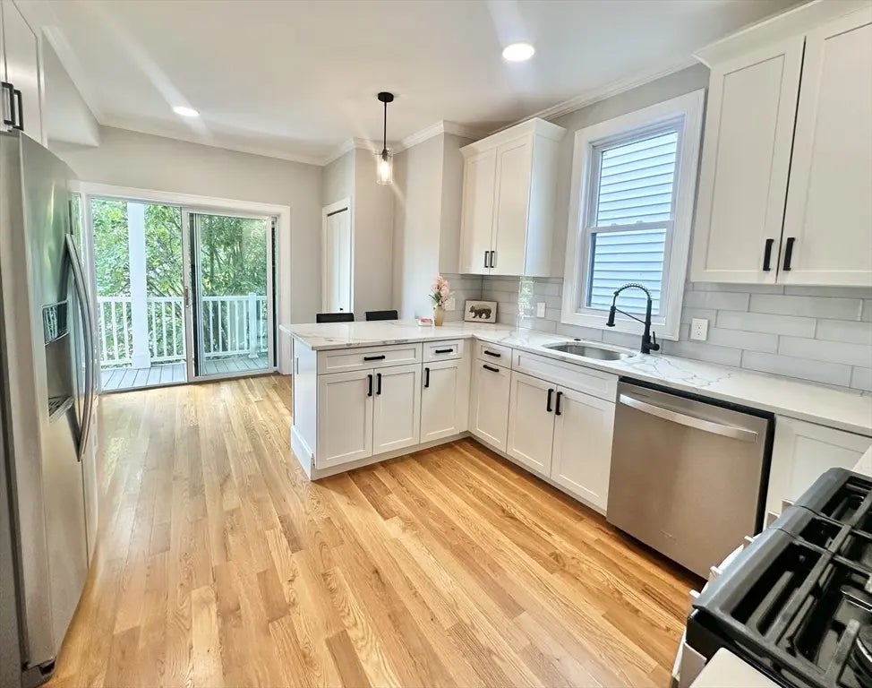 Welcome to 299 Maverick #3, an updated condo in an ideal East Boston location that features the perfect layout for this tight knit neighborhood. Walk up to your 3rd floor unit directly into the living space, with an open floor plan kitchen to your right and an oversized owner’s suite to your left. The unit’s main bathroom is right off the living area, perfect for entertaining guests. The kitchen features high end quartz countertops, upgraded appliances, and has a laundry closet. Take some time to enjoy your own private deck off the kitchen. Head back inside to check out the owner’s suite featuring ample storage for your wardrobe, and an oversized en suite bath with a dual vanity, tiled shower, and more. Additional storage is available in the basement for owners to put bikes, beach chairs, and luggage.